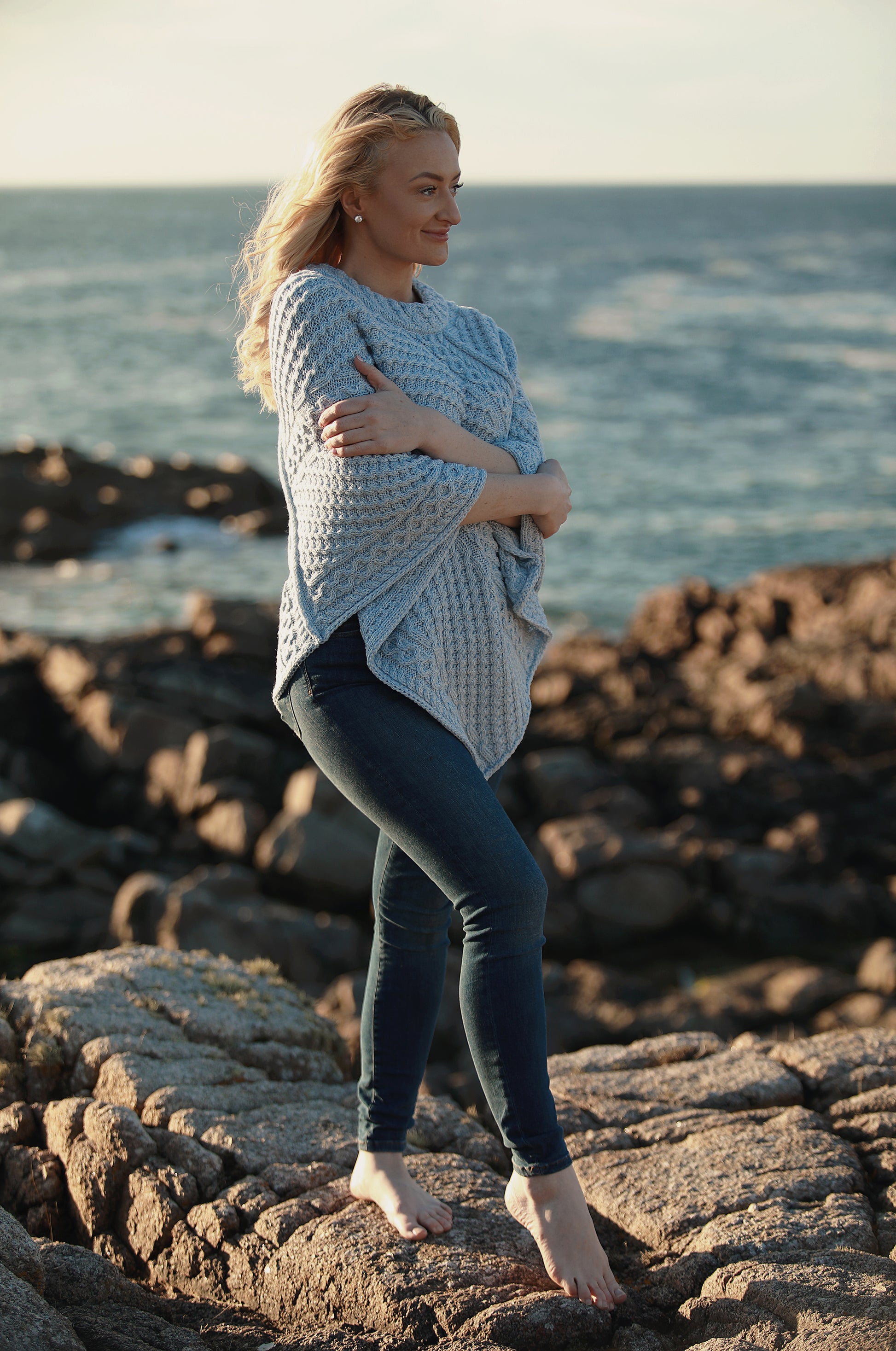 Wrap yourself in softness and tradition with this elegant Aran poncho. Made from luxurious 100% merino wool, it features classic Aran stitching in a fresh sky blue hue—perfect for layering in any season.