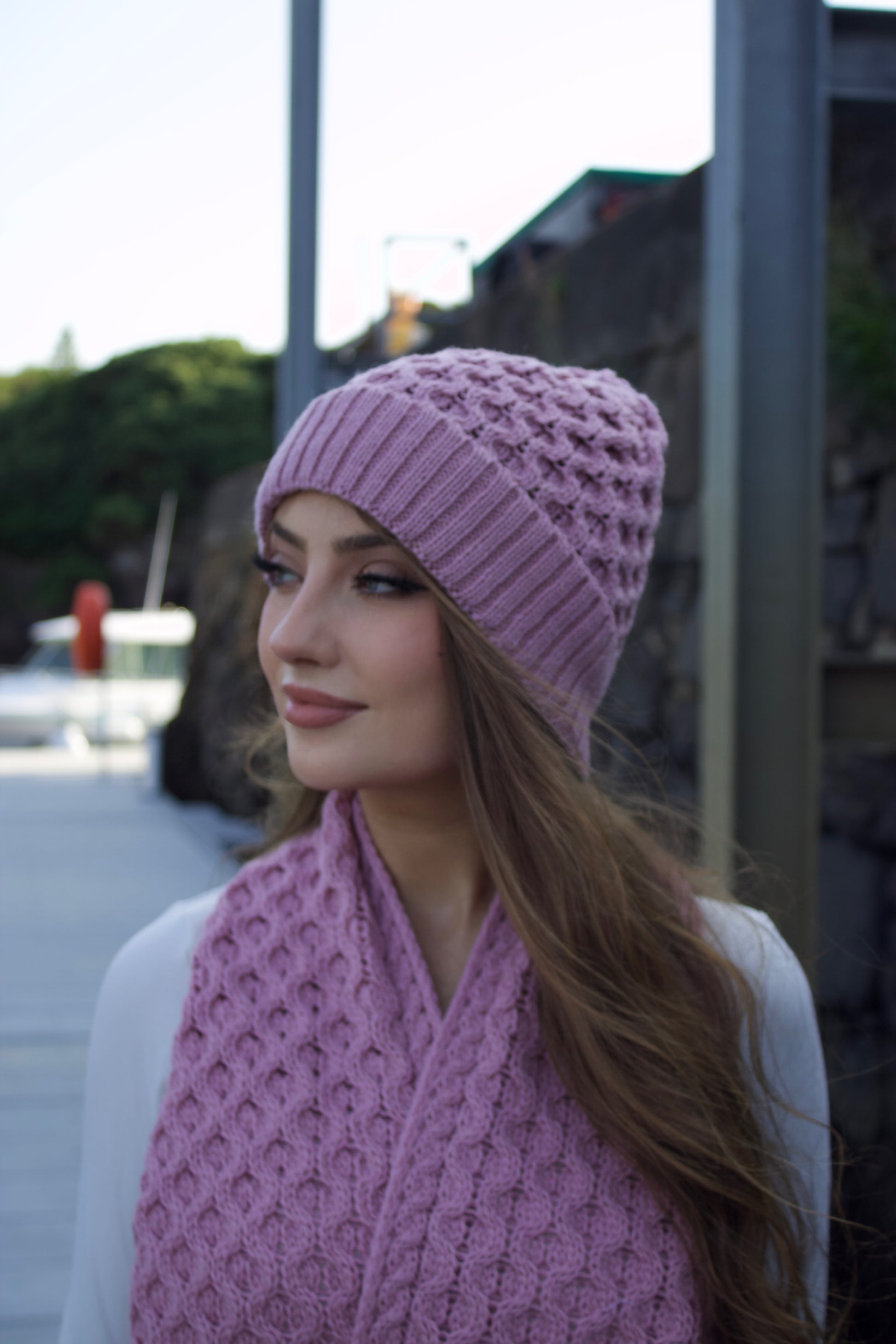 The hat offers a snug, breathable fit, while the scarf drapes beautifully long enough to wrap, layer or wear loose with ease. The soft blush tone pairs effortlessly with both winter coats and lighter knits, making this a timeless staple for colder days.