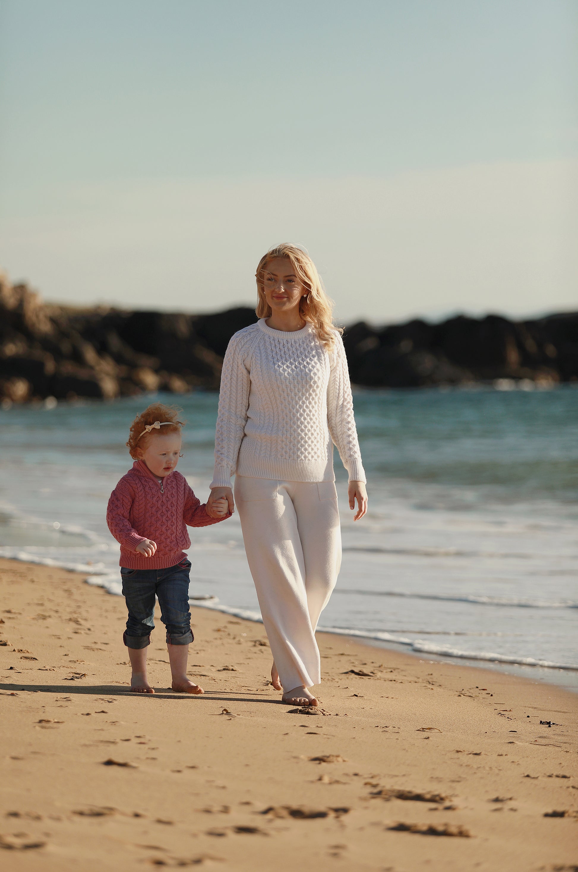 Timeless and authentic, this traditional Aran sweater is crafted in a natural white. With its classic crew neck and iconic cable patterns, it’s a warm and stylish staple that celebrates Irish heritage.