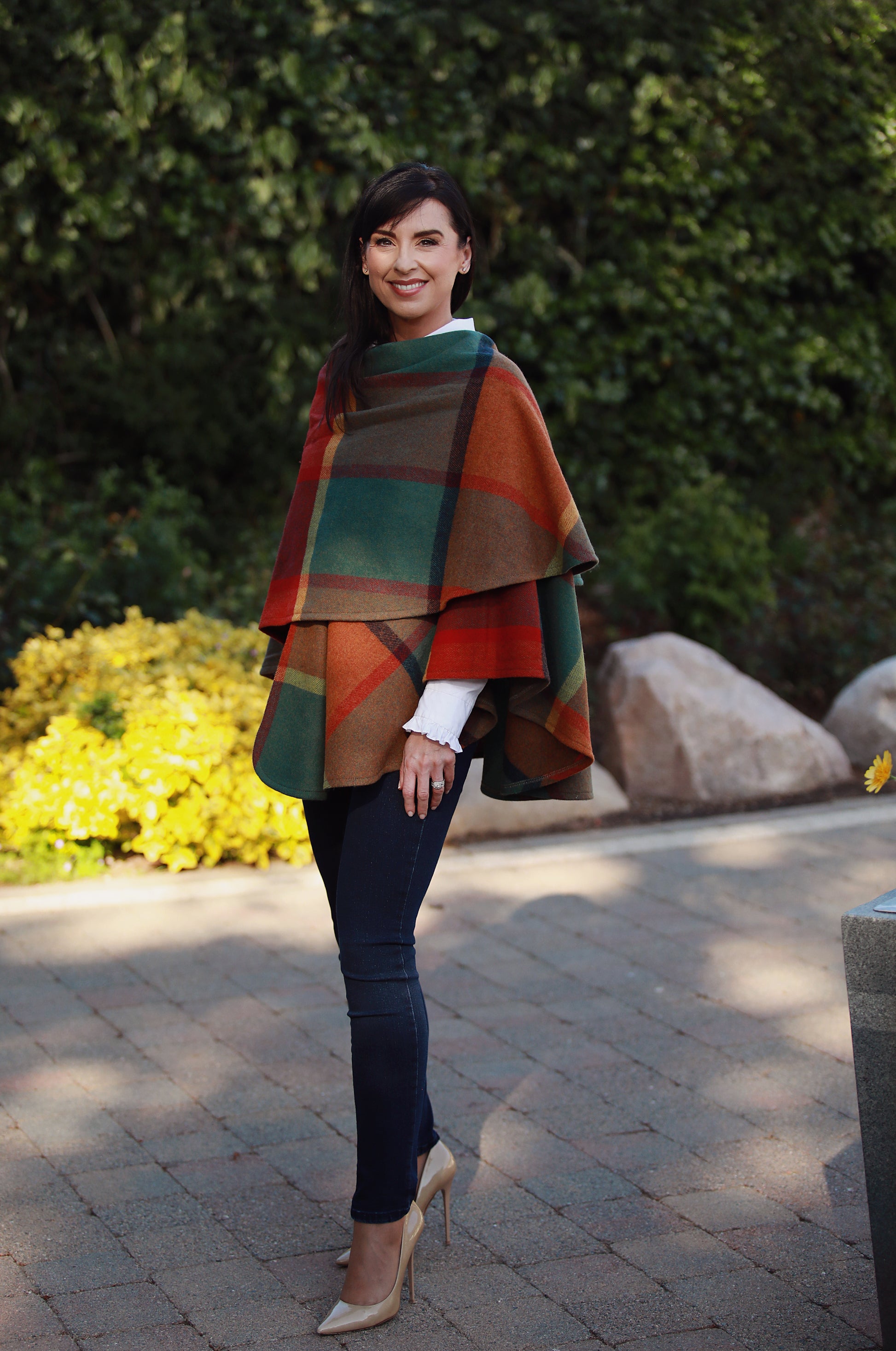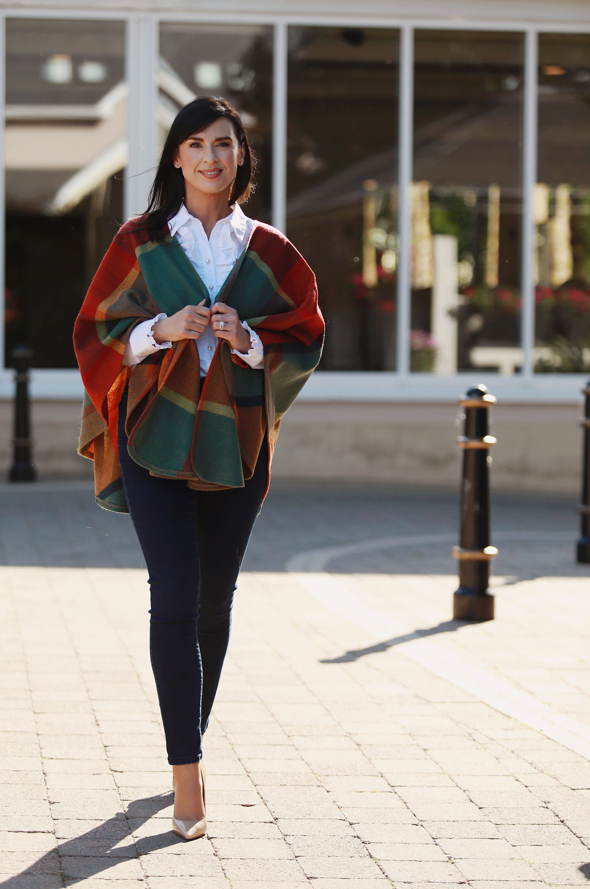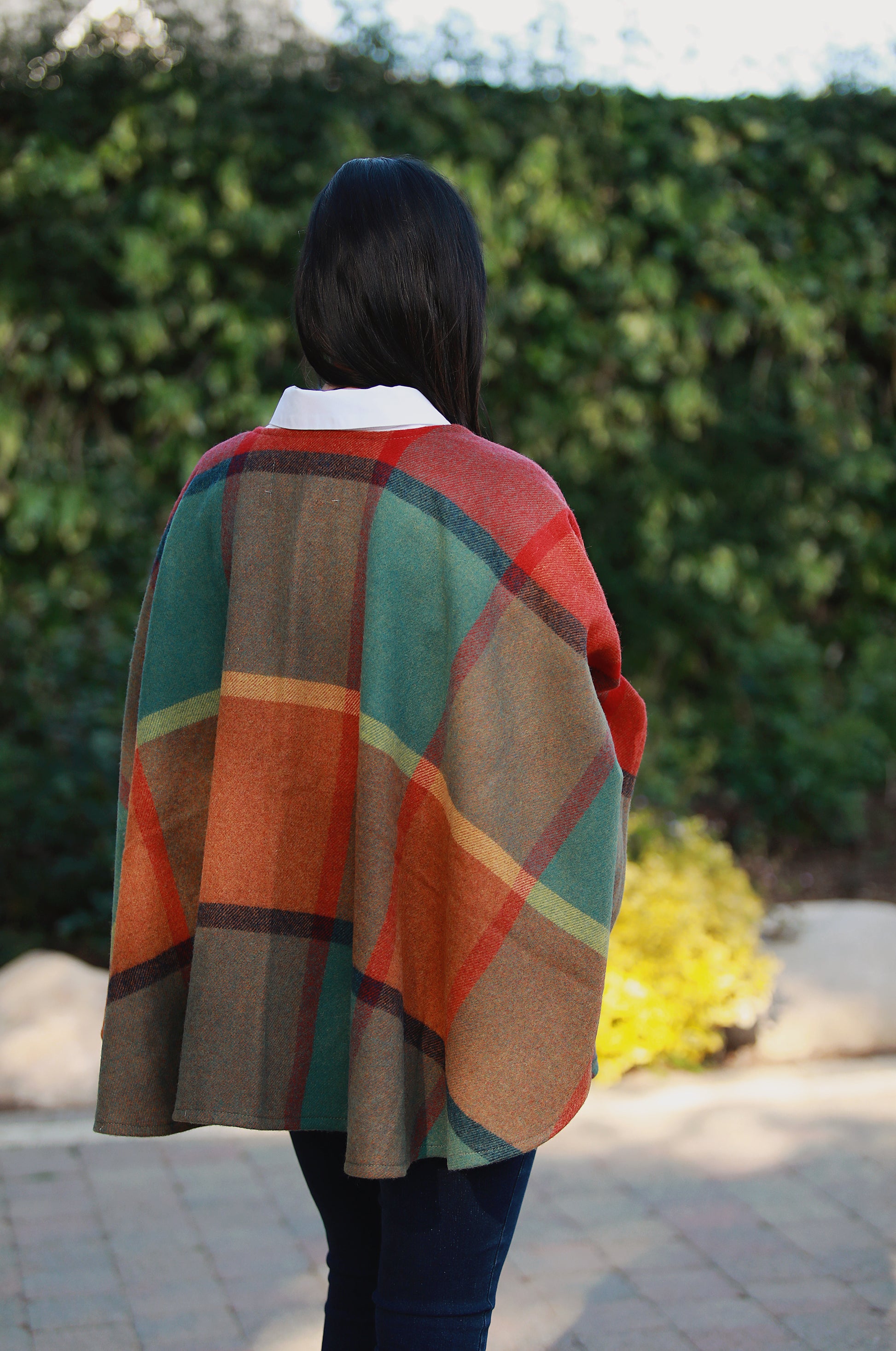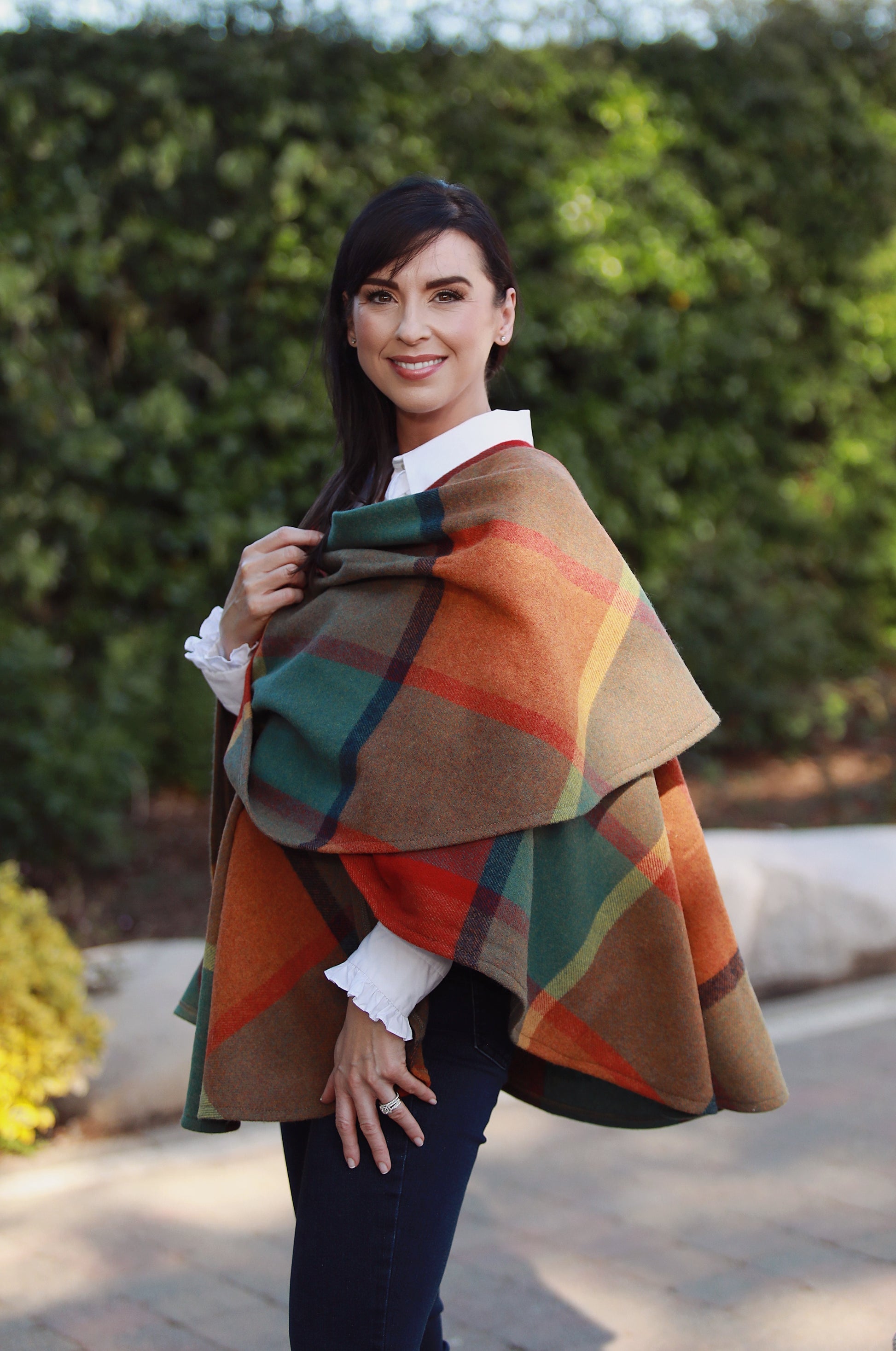 A timeless piece woven by John Hanly in Co. Tipperary, this lambswool cape is a celebration of colour, craftsmanship, and comfort. Featuring a striking check in warm orange, green, yellow and wine tones, it’s the ideal outer layer for crisp days and cooler evenings.