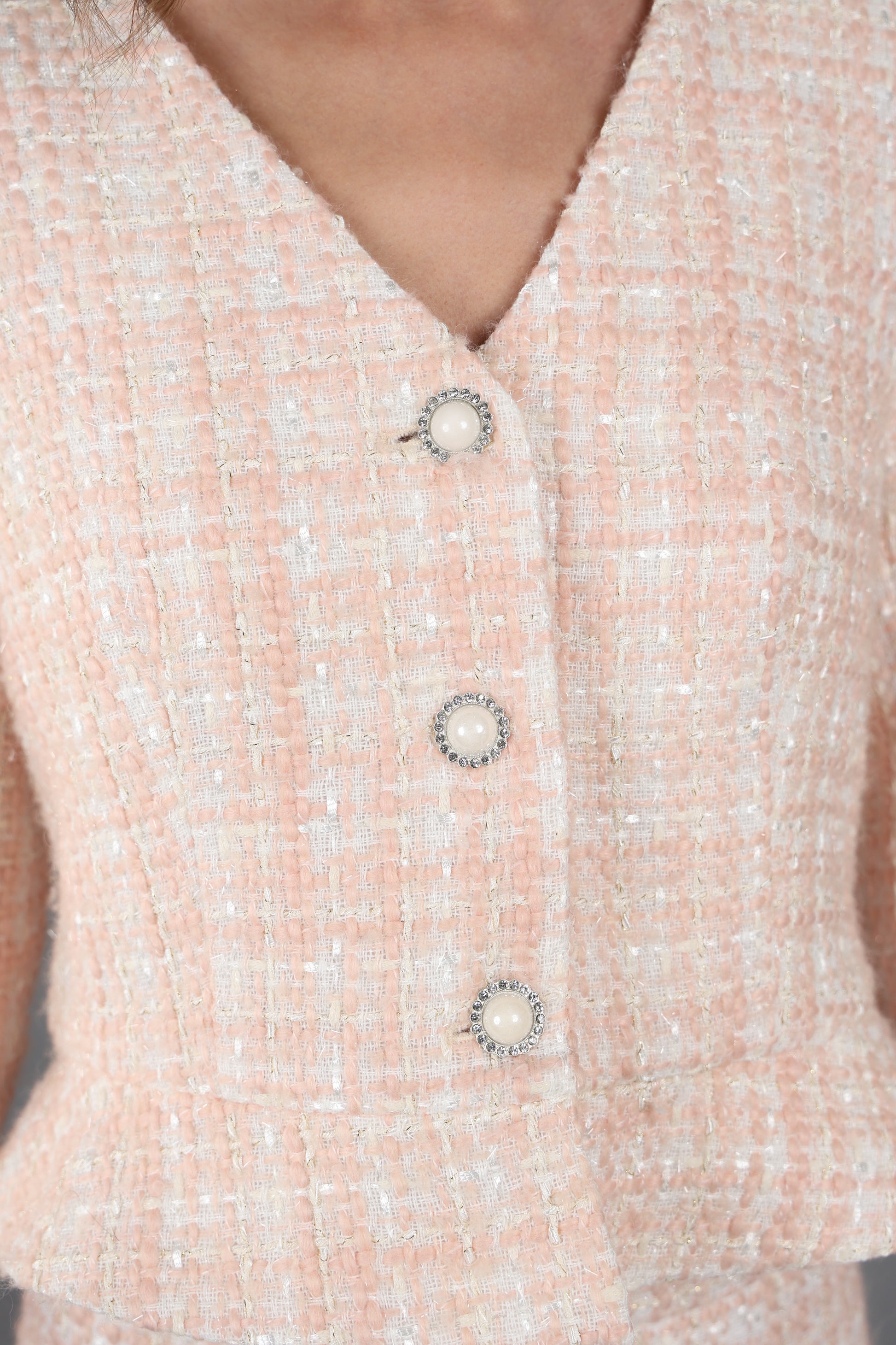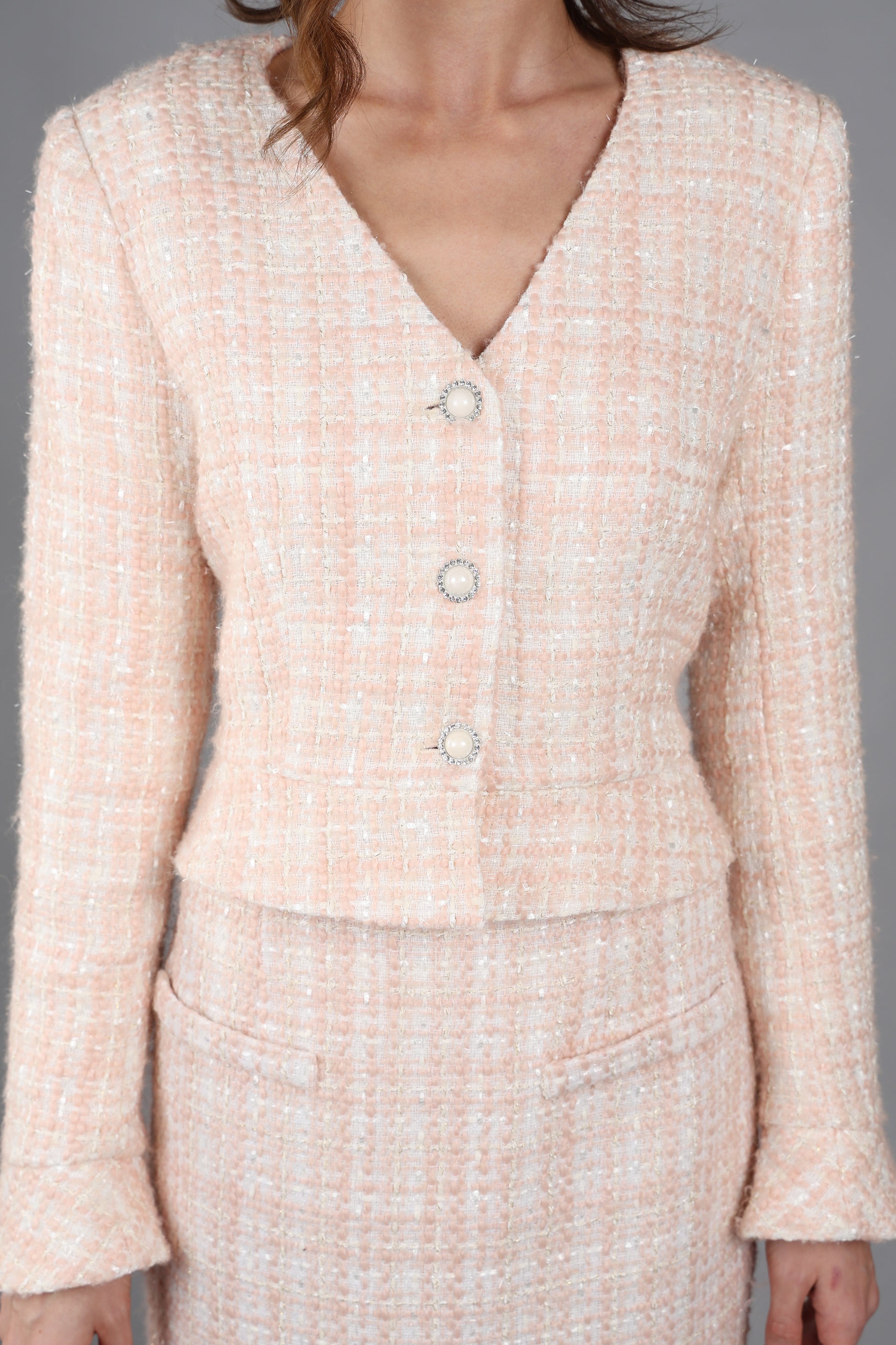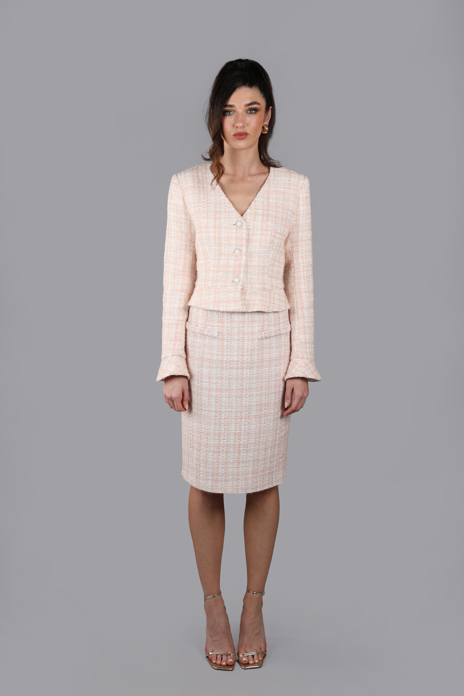 Introducing the "Melania" pink two-piece ensemble, a stunning addition to your wardrobe. Drawing inspiration from fashion icons such as Coco Chanel and Jackie O, this suit is designed to make a statement and capture attention wherever you go. Featuring elegant belle sleeves and delicate buttons, this meticulously tailored suit is adorned with custom lining and a delicate blend of colors woven throughout the fabric. Embrace sophistication and style with the Melania suit, a timeless piece that exudes charm and elegance reminiscent of classic fashion icons