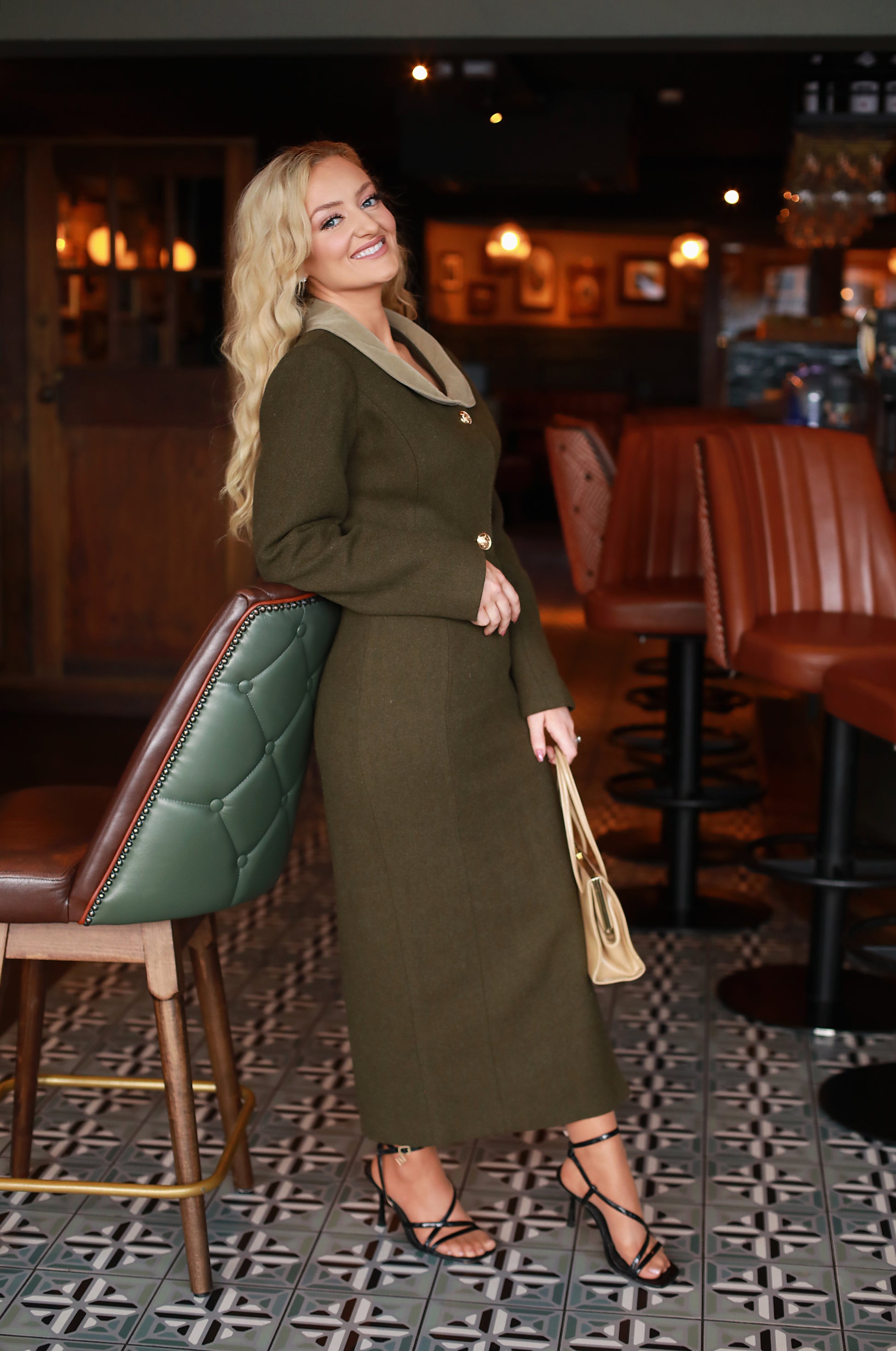 - Closure: buttoned front (Jacket), Back zip (Skirt)