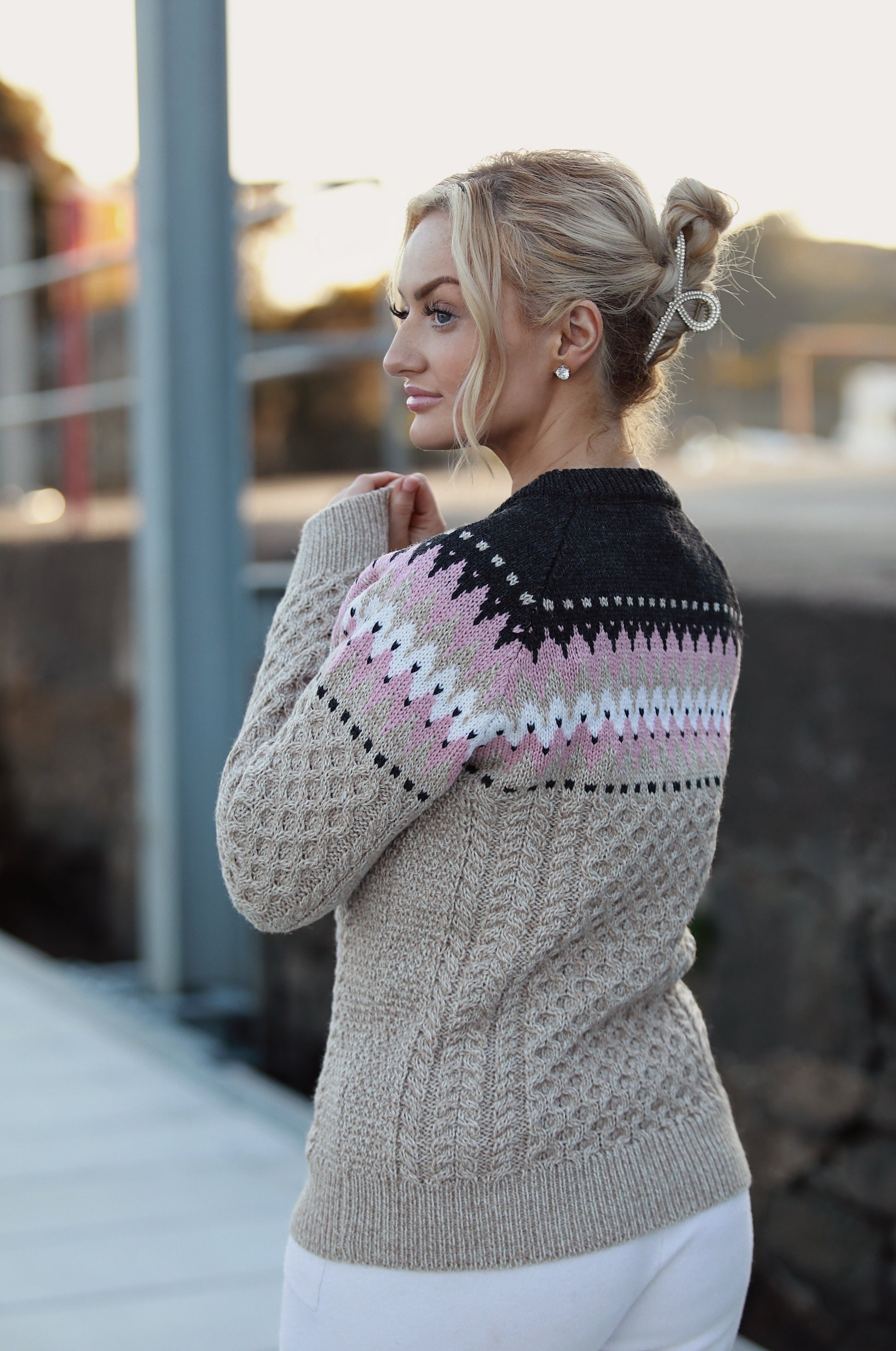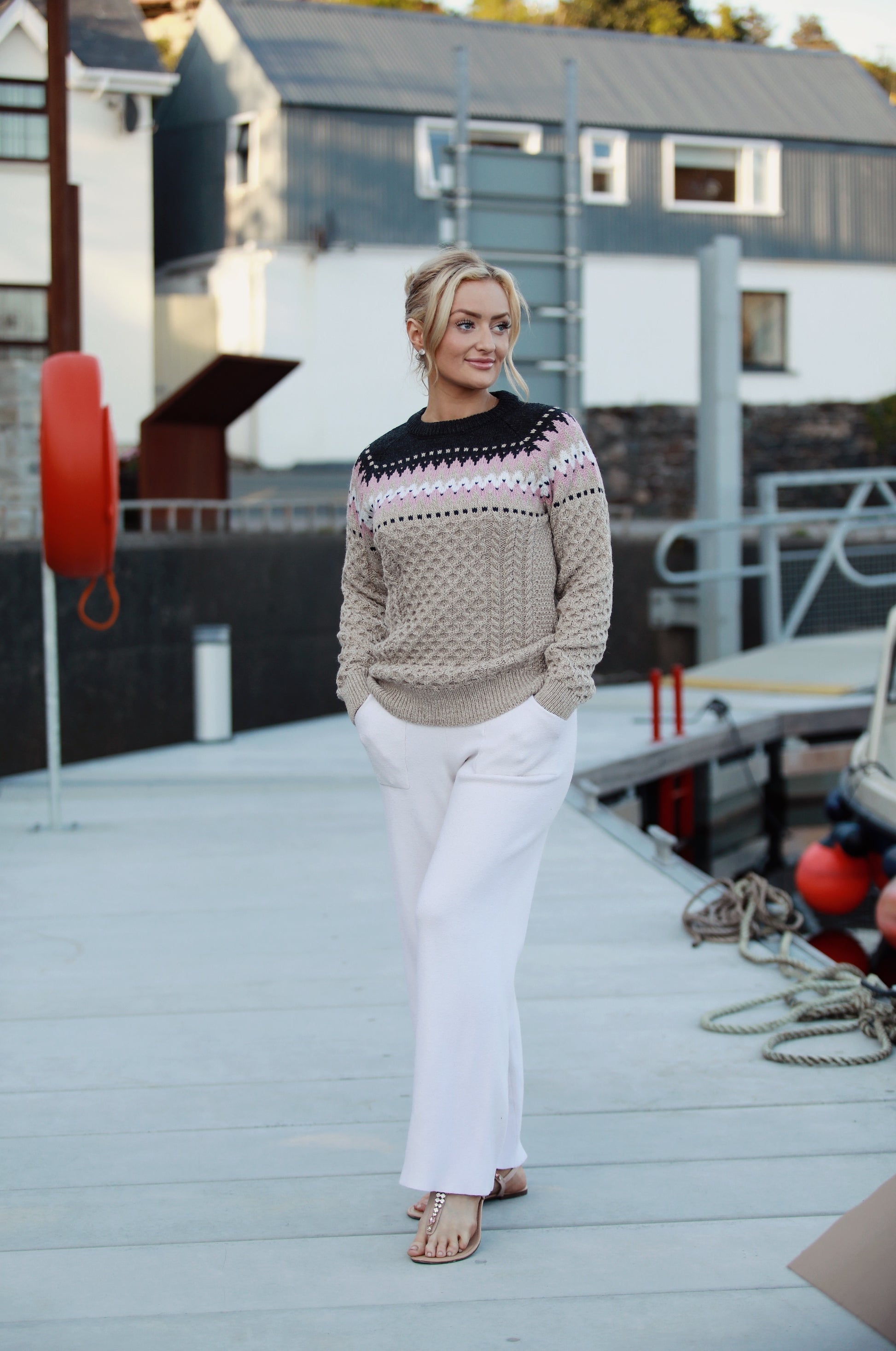 This beautifully detailed jumper is made by the Original Aran Co. in Donegal, using 100% fine merino wool. Soft, breathable, and expertly knit, it blends timeless Aran craftsmanship with a fresh, feminine twist.