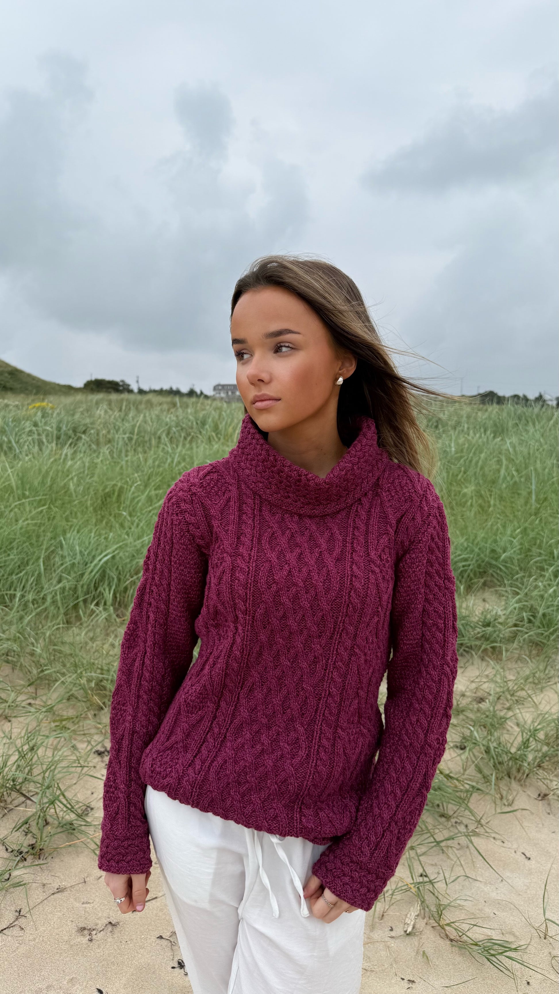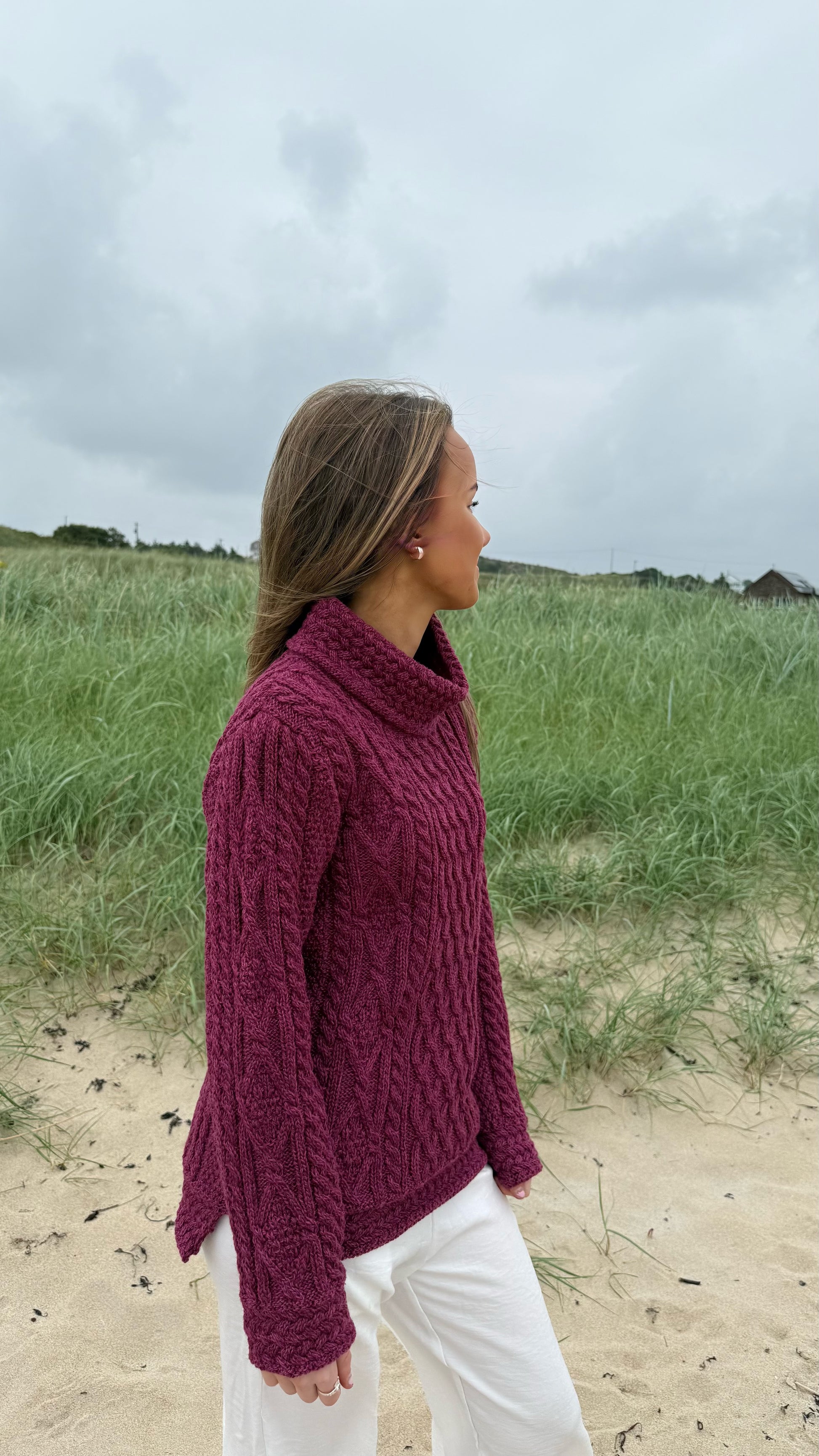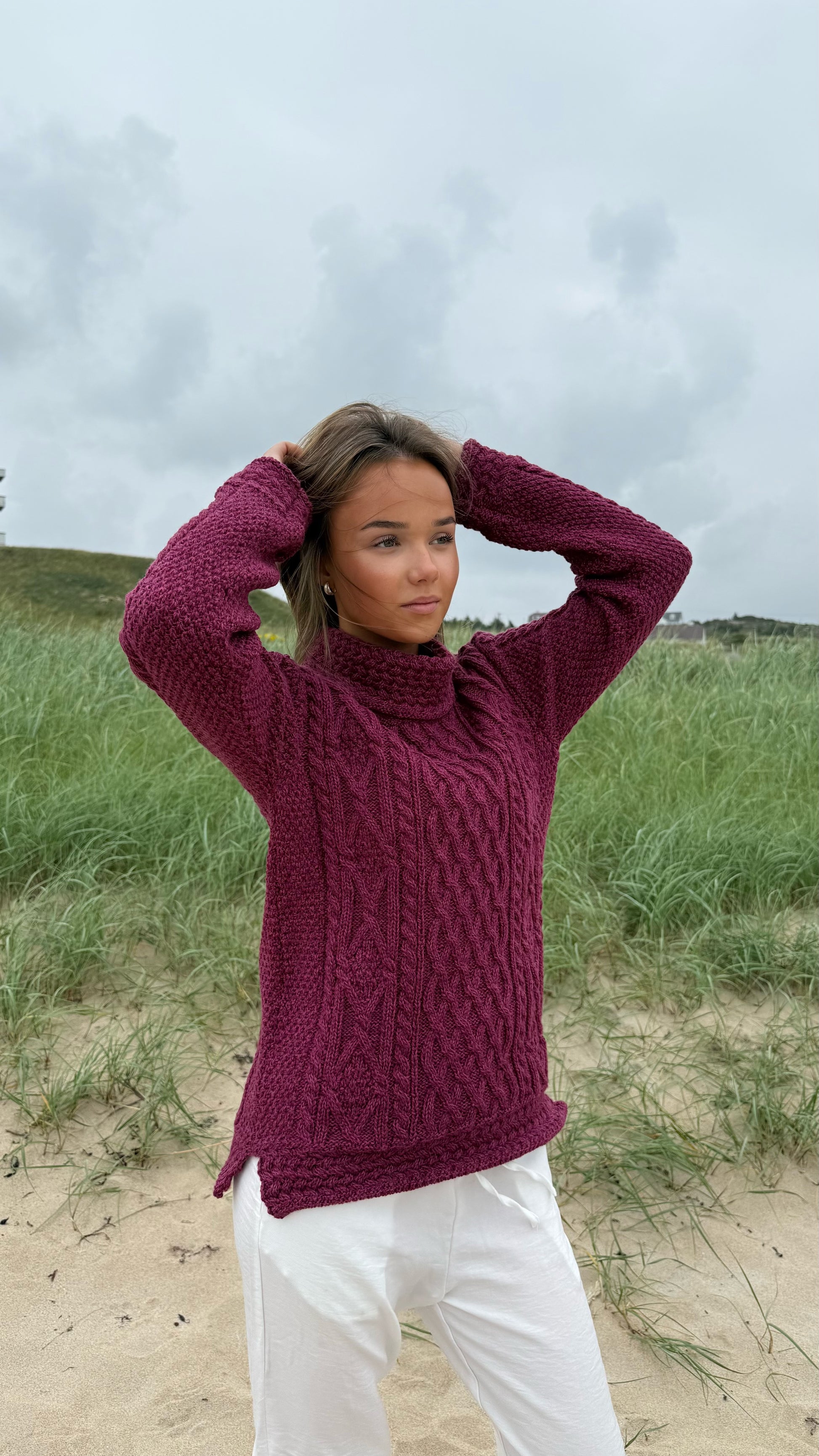 A modern classic with roots in Irish tradition, this Raspberry Marl Aran Sweater is crafted in a beautifully textured Aran knit. The rich raspberry marl shade brings depth and warmth, making it a standout piece for any wardrobe.