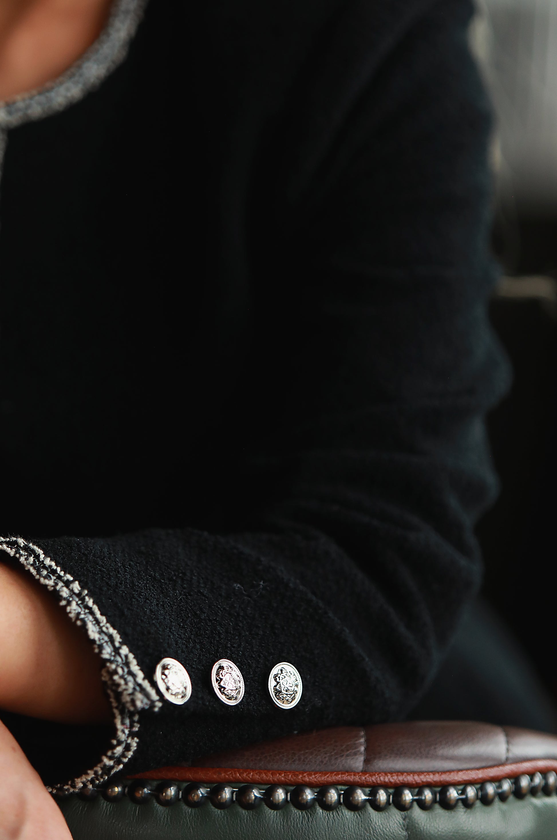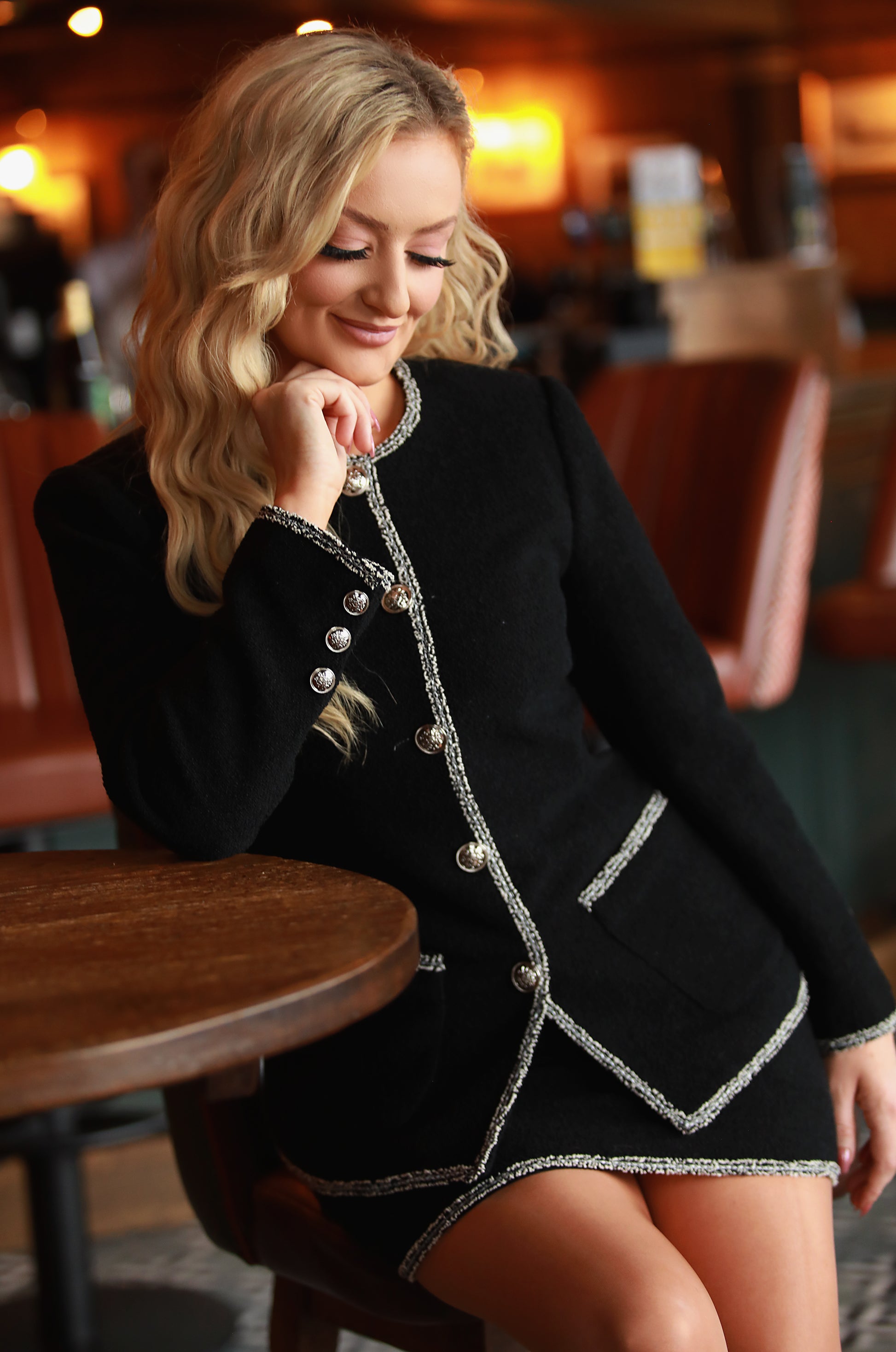 - Closure: buttoned front (Jacket), Back zip (Skirt)