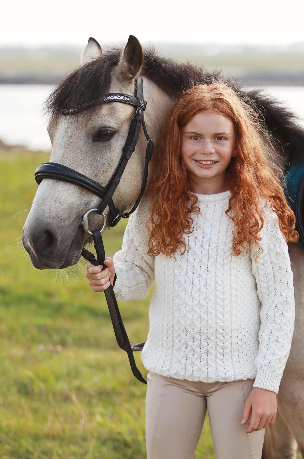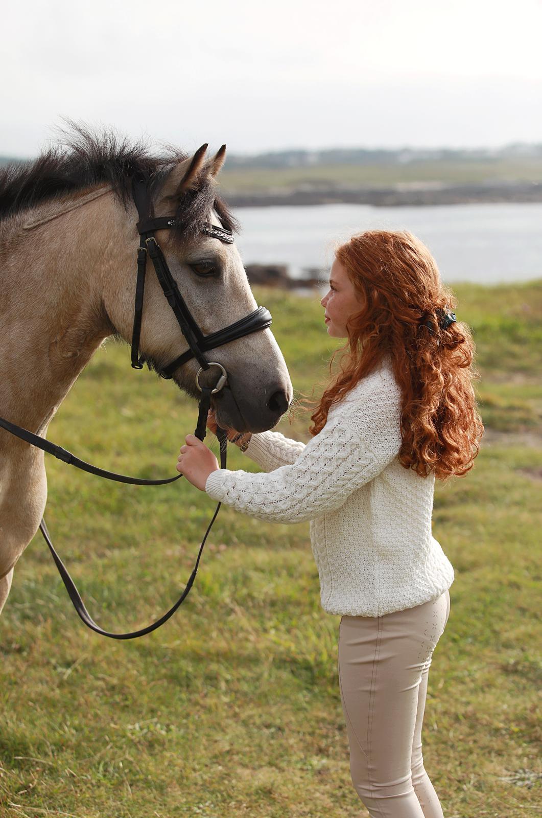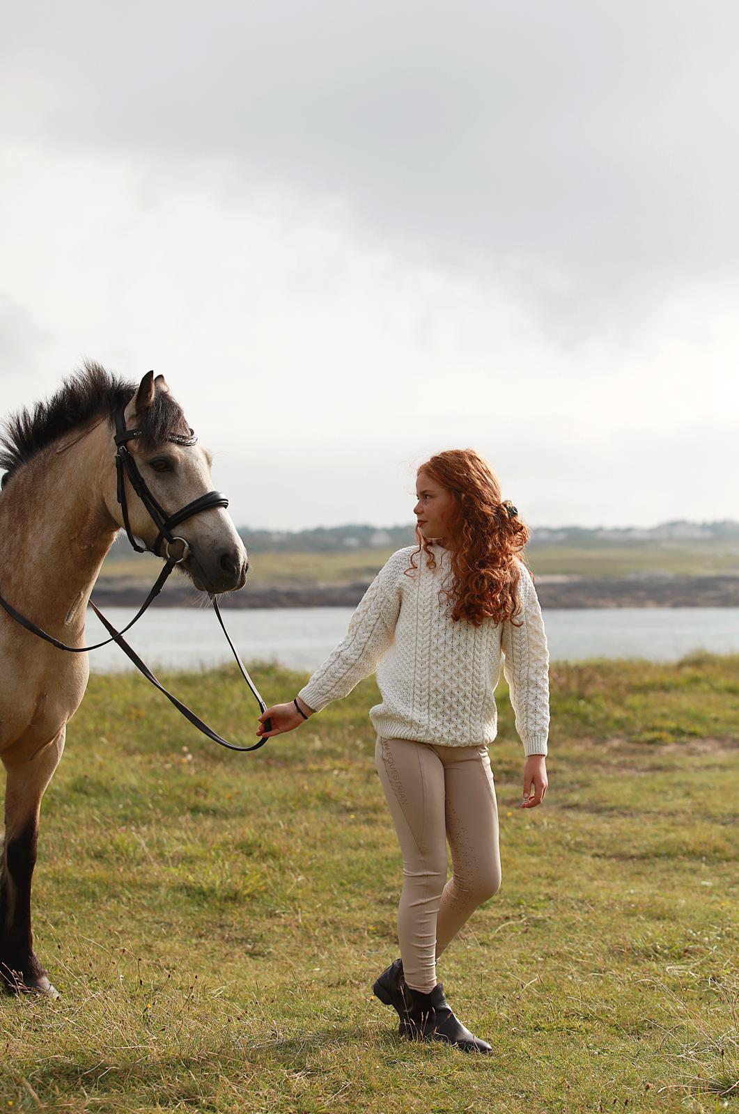 Knitted in 100% fine merino wool, it is luxuriously soft against the skin while being naturally breathable and durable. The natural colour evokes the beauty of Donegal’s wild meadows and sits beautifully with riding boots, jodhpurs, or your favourite jeans.