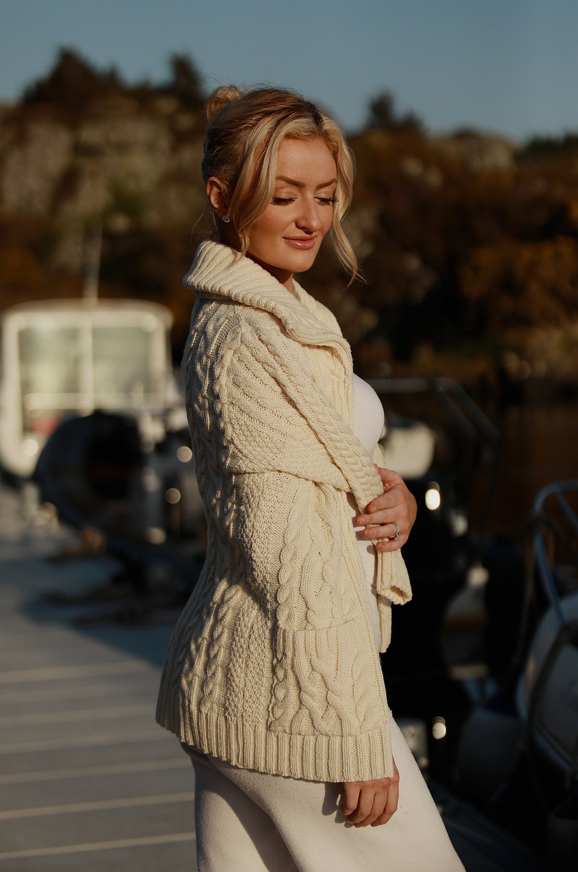 Wrap yourself in the warmth and tradition of the Irish coastline with our Original Aran Shawl Collar Cardigan, crafted from 100% soft merino wool. Featuring a classic cable knit and a flattering shawl collar, this timeless piece blends heritage craftsmanship with everyday elegance.